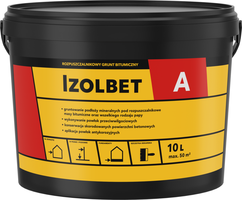 W przypadku wykonywania samodzielnej powłoki wyrób należy nakładać w 2 – 3 warstwach, każdą warstwę po wyschnięciu poprzedniej. Pierwszą warstwę nakładać szczotką dekarską, kolejne mogą być układane natryskiem. Przed rozpoczęciem kolejnych prac, grunt bitumiczny IZOLBET-A należy pozostawić do całkowitego wyschnięcia.